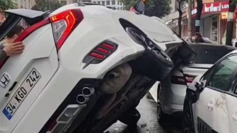 Esenyurt'ta sabah saatlerinde bir sürücü direksiyon hakimiyetini kaybederek aracıyla park halindeki 2 otomobilin üzerine çıktı. Yaşanan kaza güvenlik kamerası tarafından görüntülendi.