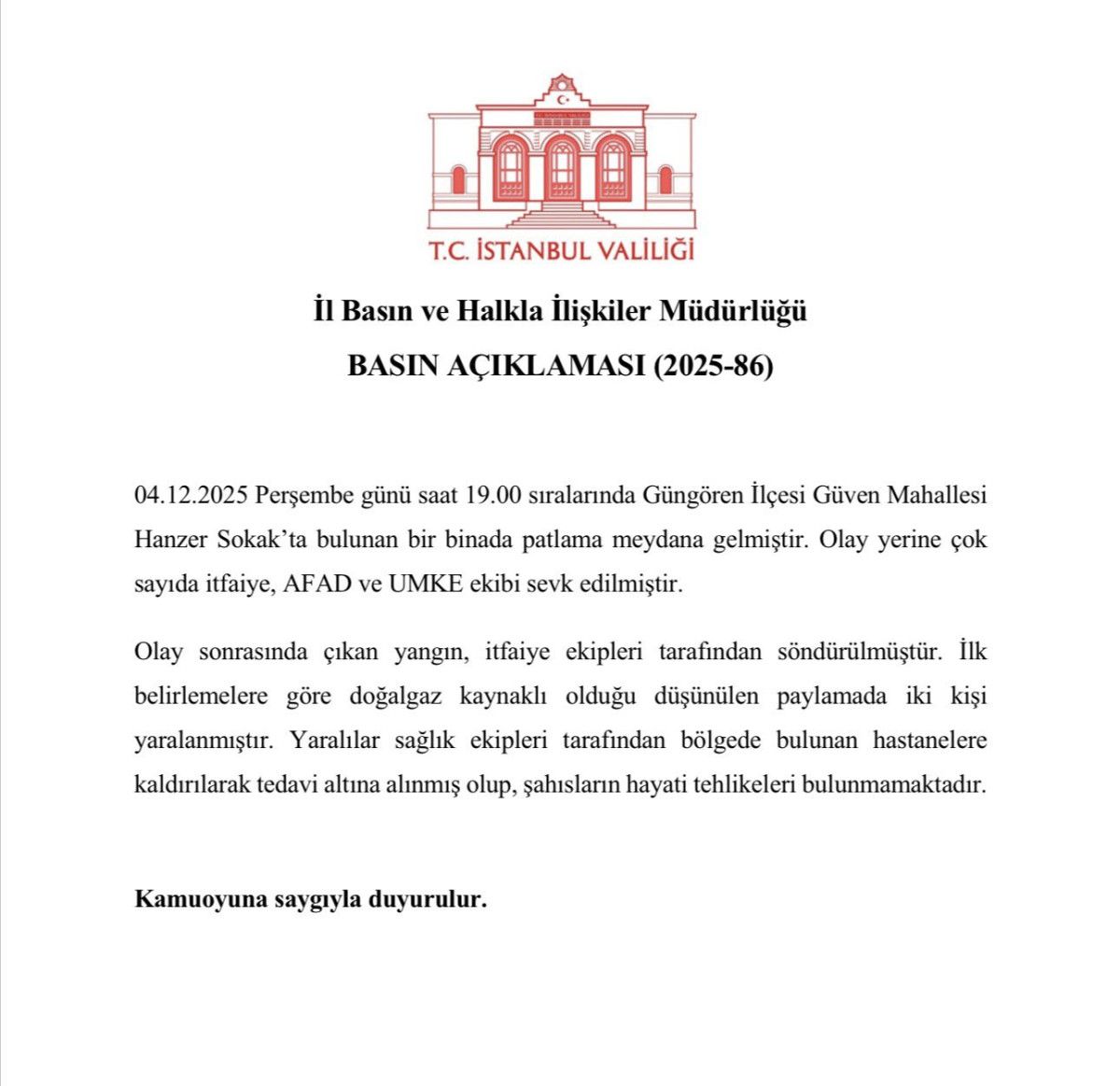 04.12.2025 Perşembe günü saat 19.00 sıralarında Güngören İlçesi Güven mahallesi Hanzer Sokak’ta bulunan bir binada patlama meydana gelmiştir. Olay yerine çok sayıda itfaiye, AFAD ve UMKE ekibi sevk edilmiştir. Olay sonrasında çıkan yangın, itfaiye ekipleri tarafından söndürülmüştür.