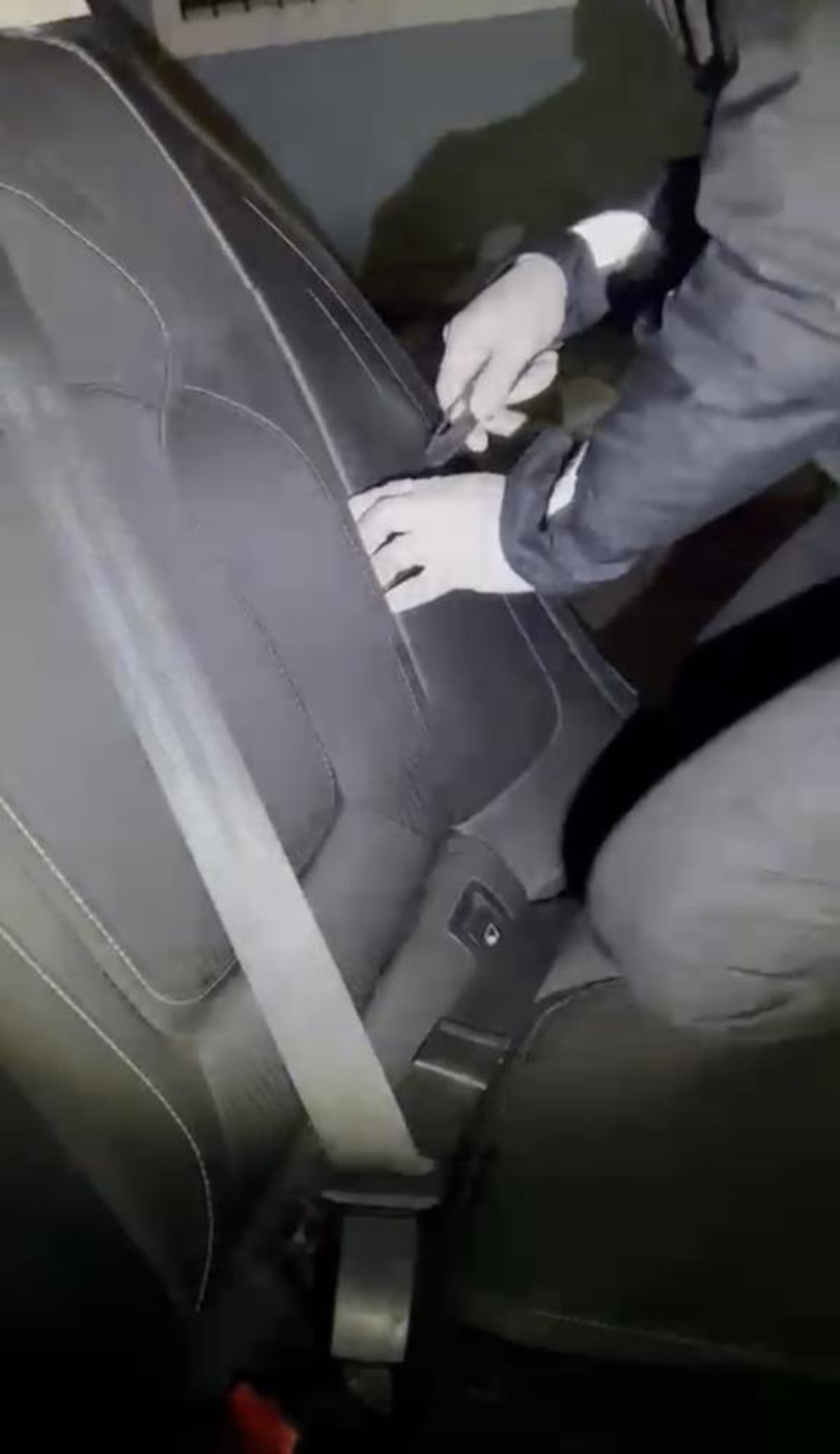 Çalışmalar esnasında sağ arka koltuğun yan bölümünde bir farklılık gören polis, bıçak yardımıyla plastik bölmeyi çıkartınca içerisinde bir çanta olduğunu gördü.