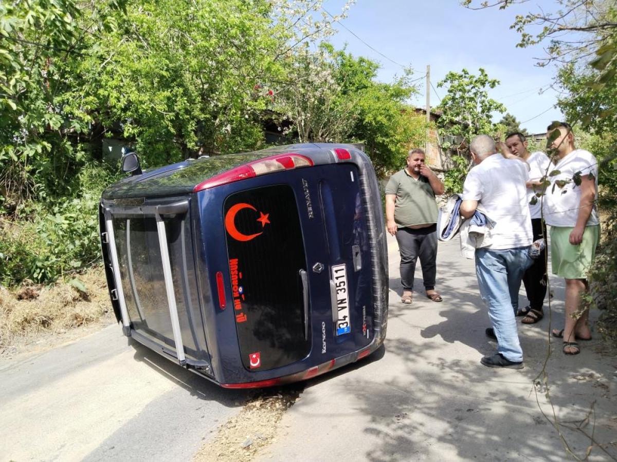 Yokuş aşağı kayan araç, önce yolun sağındaki taşlık alana vurdu. Ardından takla atarak durabildi.