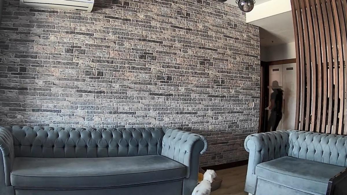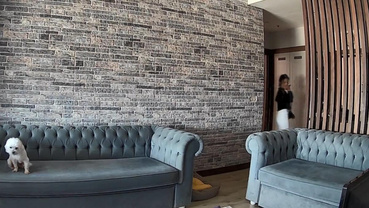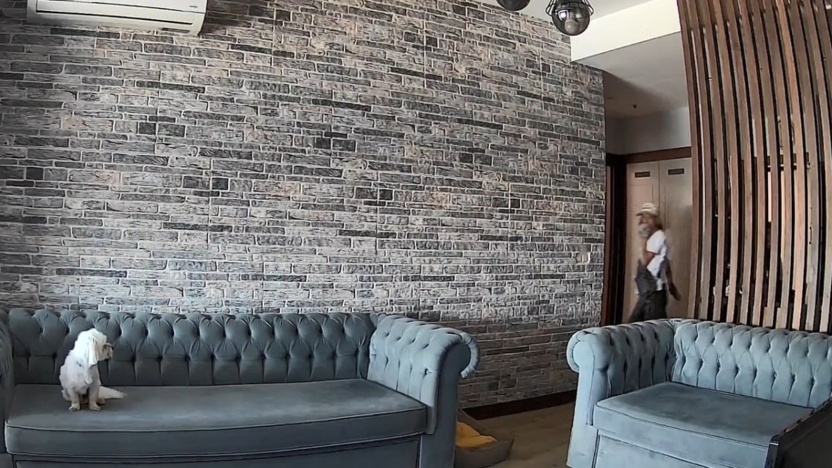 Evin salonundaki koltuğa çıkarak hırsızları izleyen köpek, zaman zaman kuyruk salladı.