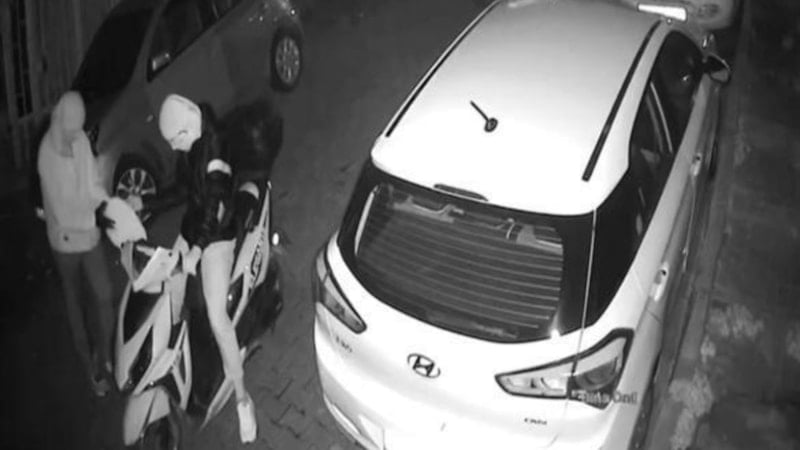 Görüntülerde, motosikletle sokakta ilerleyen 2 kişiden biri cep telefonuyla kayıt alıyor.