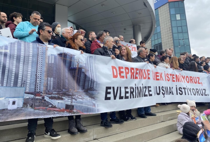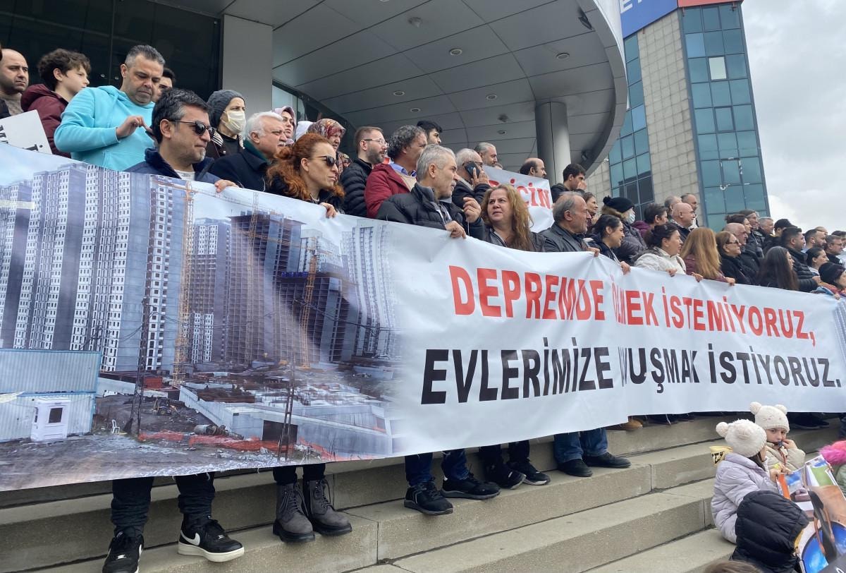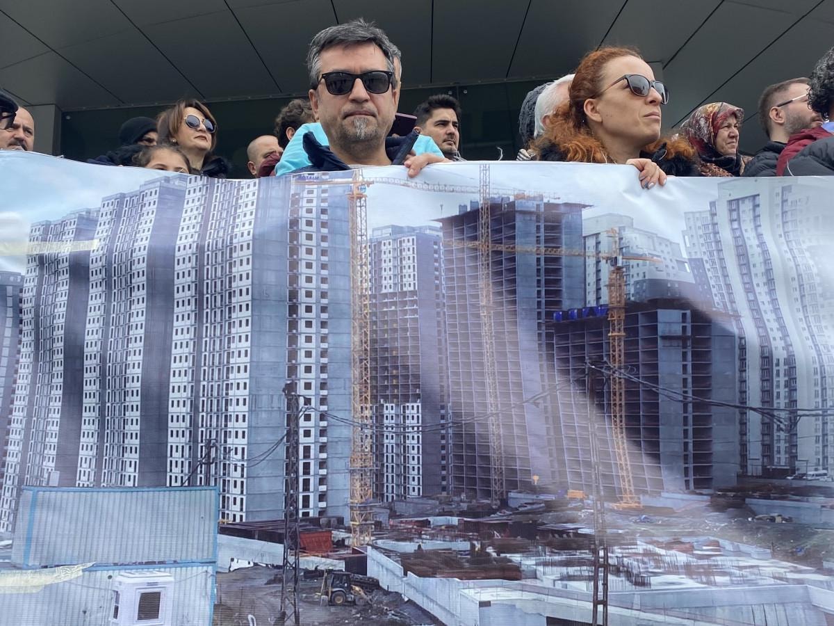 Pankartlar açıp, sloganlar atan ev sahipleri, satın aldıkları evlerin teslim edilmemesi sebebiyle birçok mağdurun halen depreme dayanıksız evlerde oturmak zorunda kaldığını belirtti.