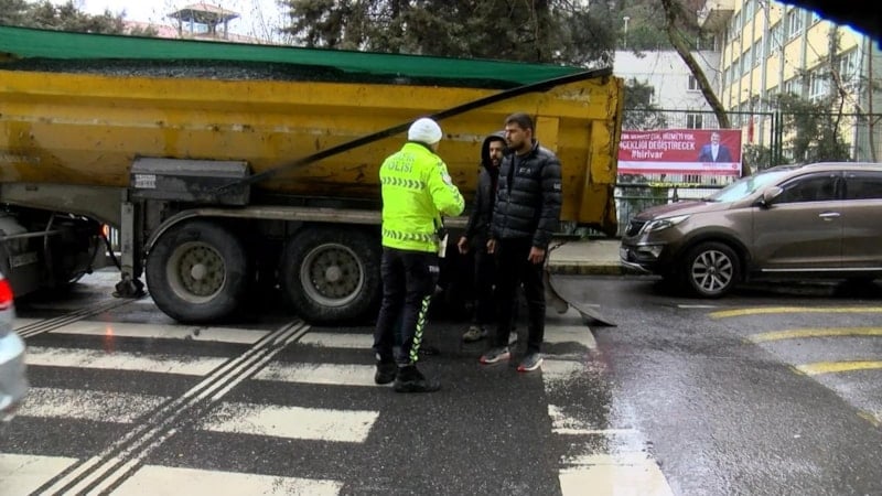 Kaza anı bir iş yerinin güvenlik kamerasına yansıdı. Görüntülerde, yokuştan inen kamyonun aniden arka lastiği yerinden çıkarak öğrencilerin üzerine doğru yuvarlanıyor. O sırada yoldan geçenler yardıma geliyor.