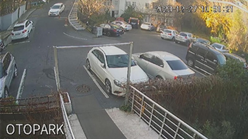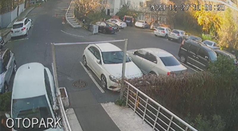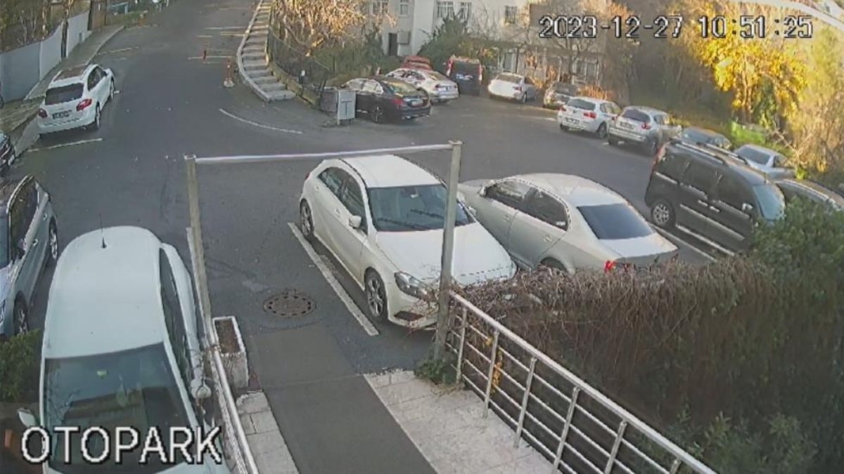 Beşiktaş’ta otomobilliyle yokuş aşağıya inen kadın sürücünün fren yerine gaza basınca korkulukları kırarak bina boşluğuna uçtuğu anların görüntüleri ortaya çıktı.