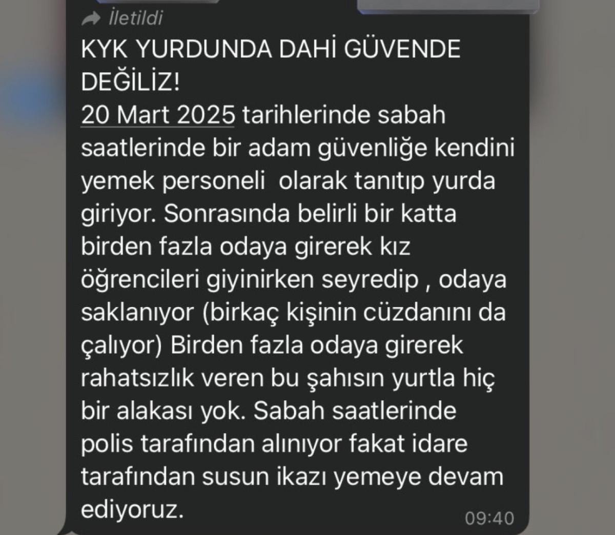Genç kızın tepkisi ve diğer öğrencilerin yardım istemesi üzerine yurt güvenlik görevlileri M.K.'yi yakaladı.
