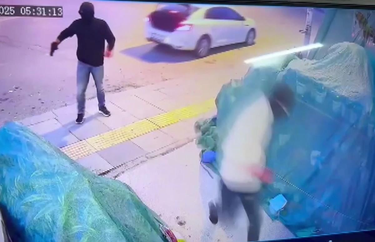 Görüntülerde, silahlı bir şüphelinin iş yerinin önünde durduğu, diğer şüphelilerin ise kasayı taşıyarak dışarı çıkardıkları görülüyor.
