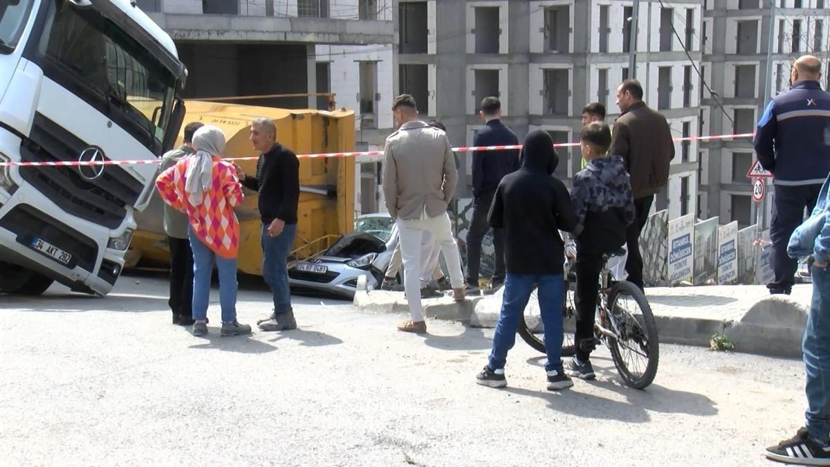 O sırada sokakta seyir halinde olan otomobilin üzerine kamyonun dorsesi devrildi.