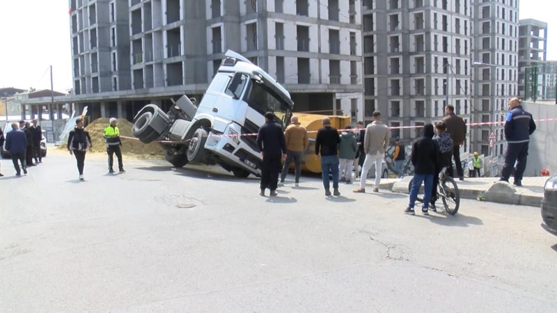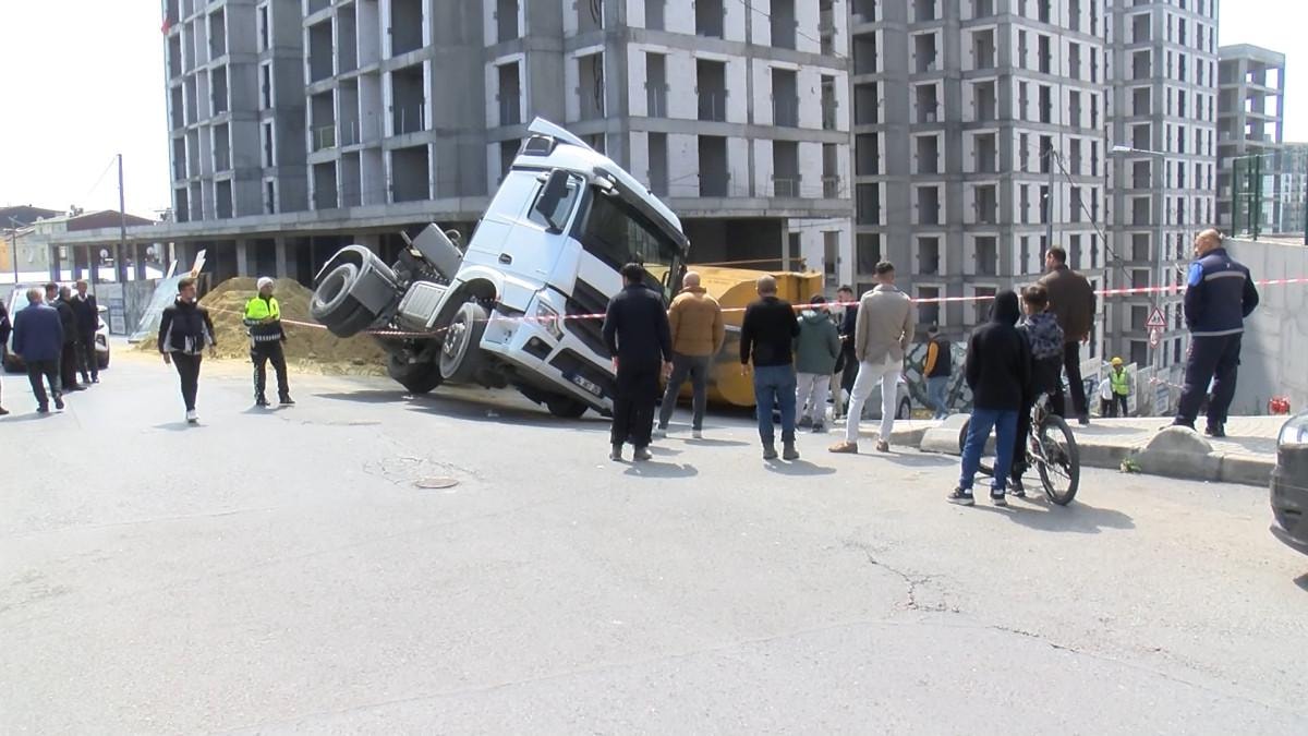 Hafriyat kamyonunun şoförü inşaata kum dökmek için dorseyi kaldırdığı sırada kamyon yan yattı.