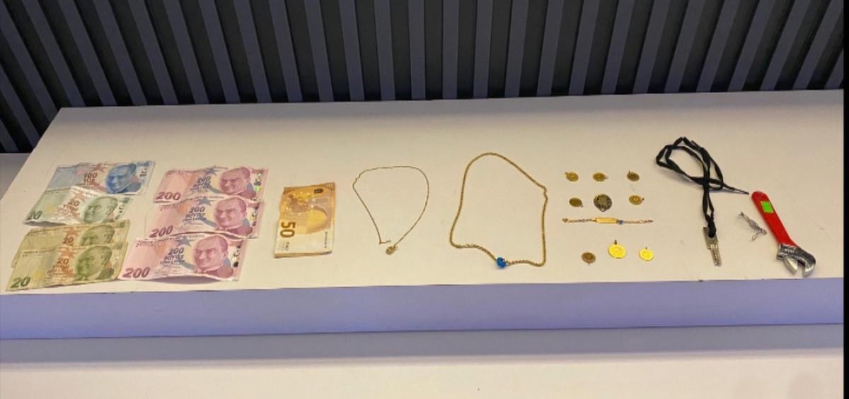 Çaldıkları altınlarla birlikte yakalanan şüphelilerin üzerinden kapı açmakta kullandıkları bir İngiliz anahtarı ve bir maymuncuk bulundu.