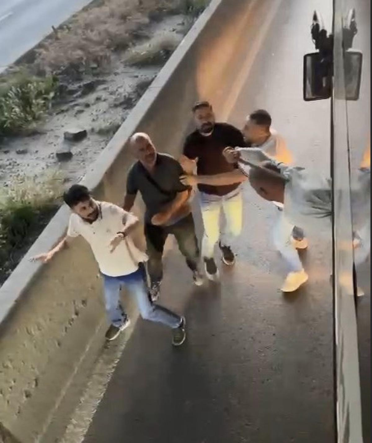 Camdan cama kavga yetmeyince otomobilde bulunan otobüsün önünü kesti.