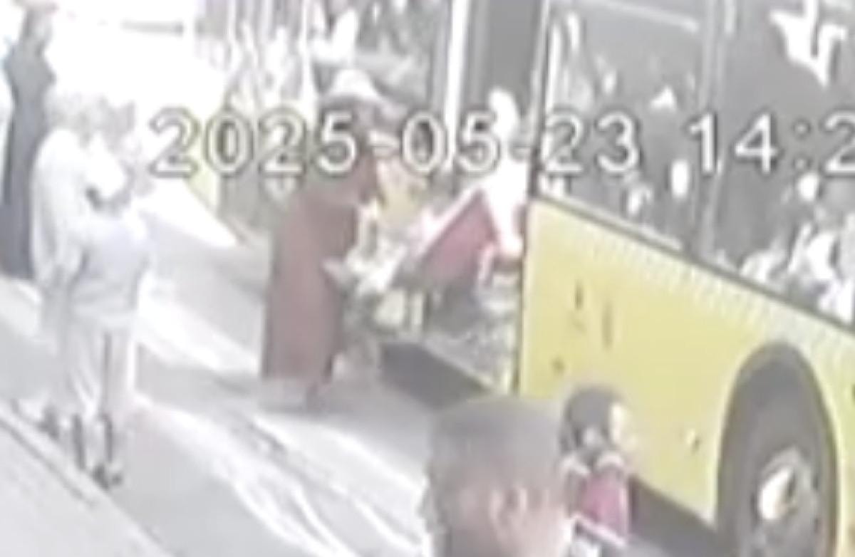 Görüntülerin ilkinde bebeğin otobüsten inerken arabasından düşmesi yer alırken diğer görüntü de ise yine bebek arabasının kapıya sıkışması yer aldı.