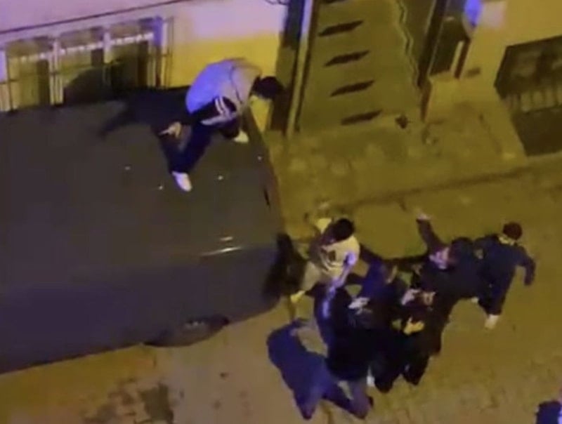 Kavga sırasında bir kişi, kendisine saldıran gruptan kaçmak için park halindeki minibüsün üzerine çıktı.