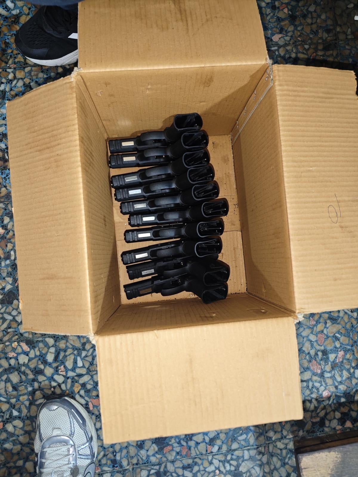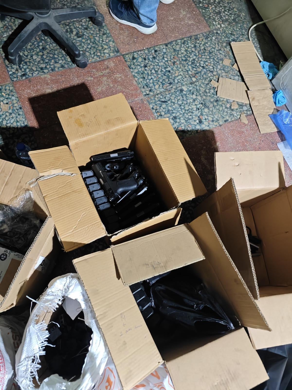 Adreste yapılan aramada 41 adet 9 mm silah ve bu silahlara ait şarjörler, 17 adet Glock ibareli silah ve şarjörler, 11 adet 7.65 mm silah, 1 adet otomatik tabanca, bin 300 adet kurusıkı tabanca, 3 bin 240 adet yiv set oluşturulmuş açık uçlu namlu, 290 adet şarjör ve farklı markalardan 540 adet kurusıkı tabanca ele geçirildi.