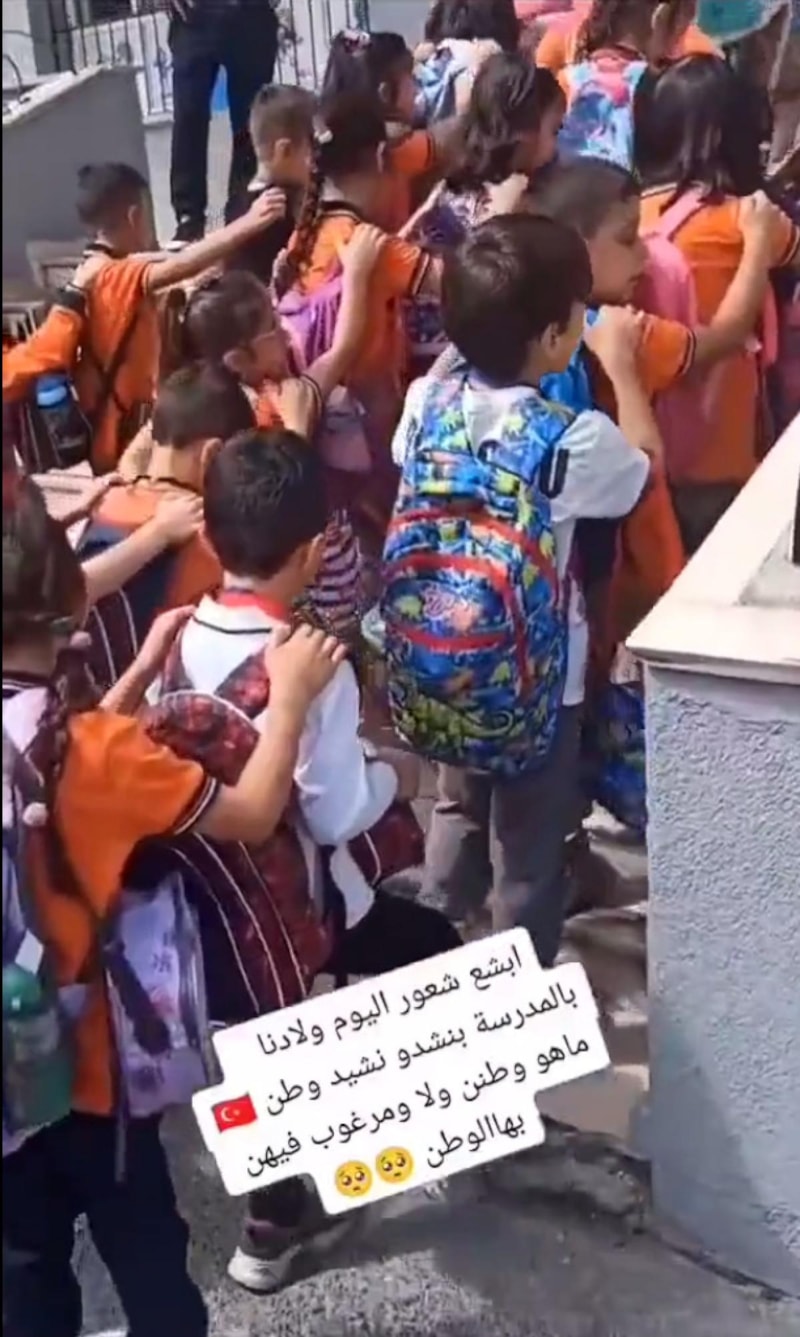 Bunun üzerine videoya bir not yazan Suriyeli veli, "Bugünün en utanç verici duygusu çocuklarımızın bize ait olmayan bir milli marşı zorla söyletilmesidir." şeklinde bir not düştü.