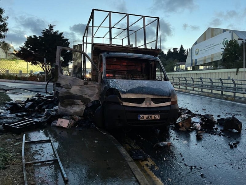 Yangın sonrası araç ve içindeki kargo malzemeleri tamamen yanarak, kullanılamaz hale geldi.