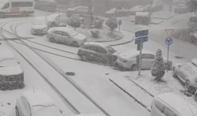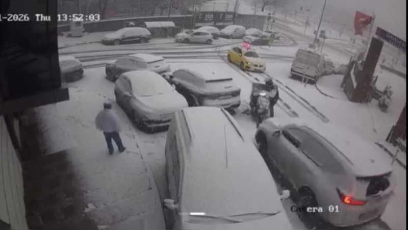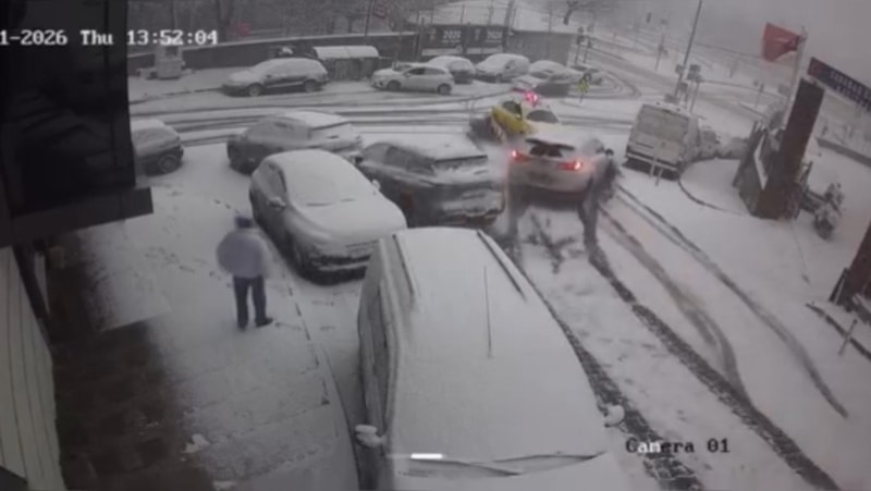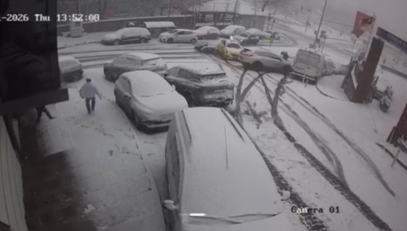 Kağıthane'de karlı yolda aracıyla yokuştan inen bir sürücü kaymaya başladı. Sürücünün direksiyon hakimiyetini kaybettiği araç, çarptığı motokuryeyi sürükledikten sonra 5 araca daha çarparak durabildi. Olay anı güvenlik kamerasına yansıdı.