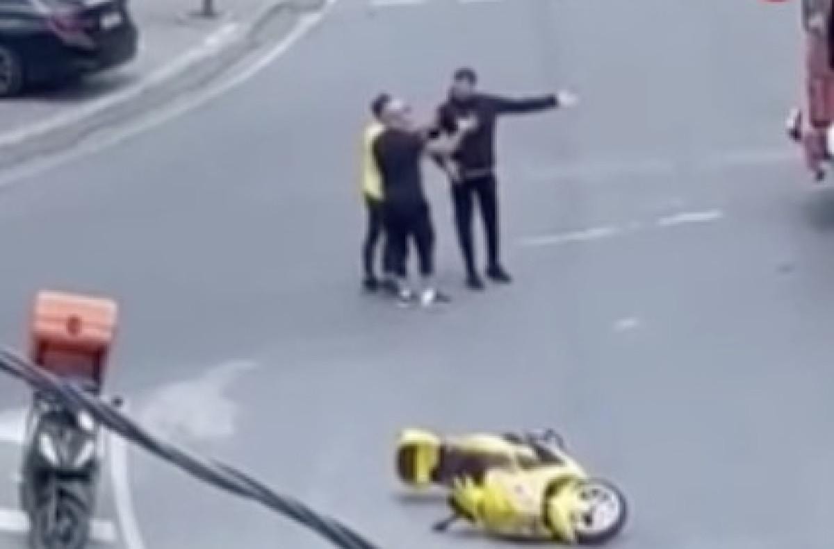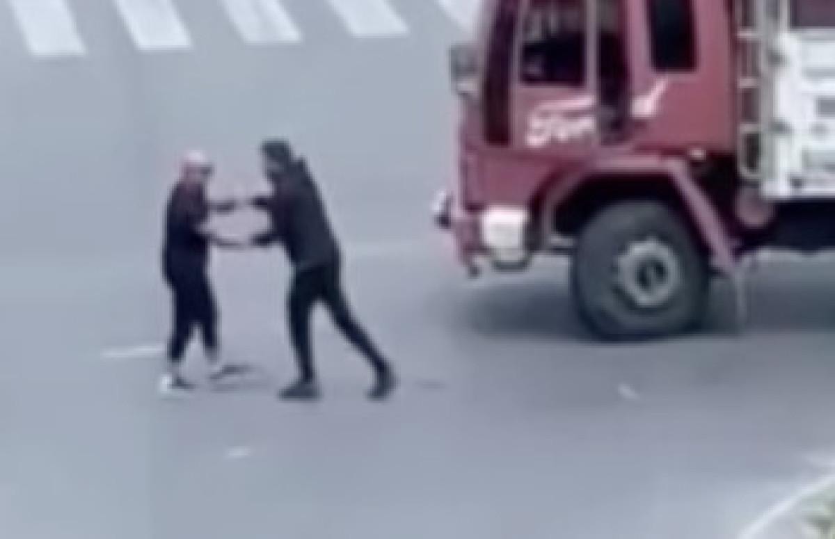 Motosikletli ve kamyon sürücüsü arasında yaşanan kavga anları, bir vatandaşın cep telefonu kamerasıyla saniye saniye kaydedildi.