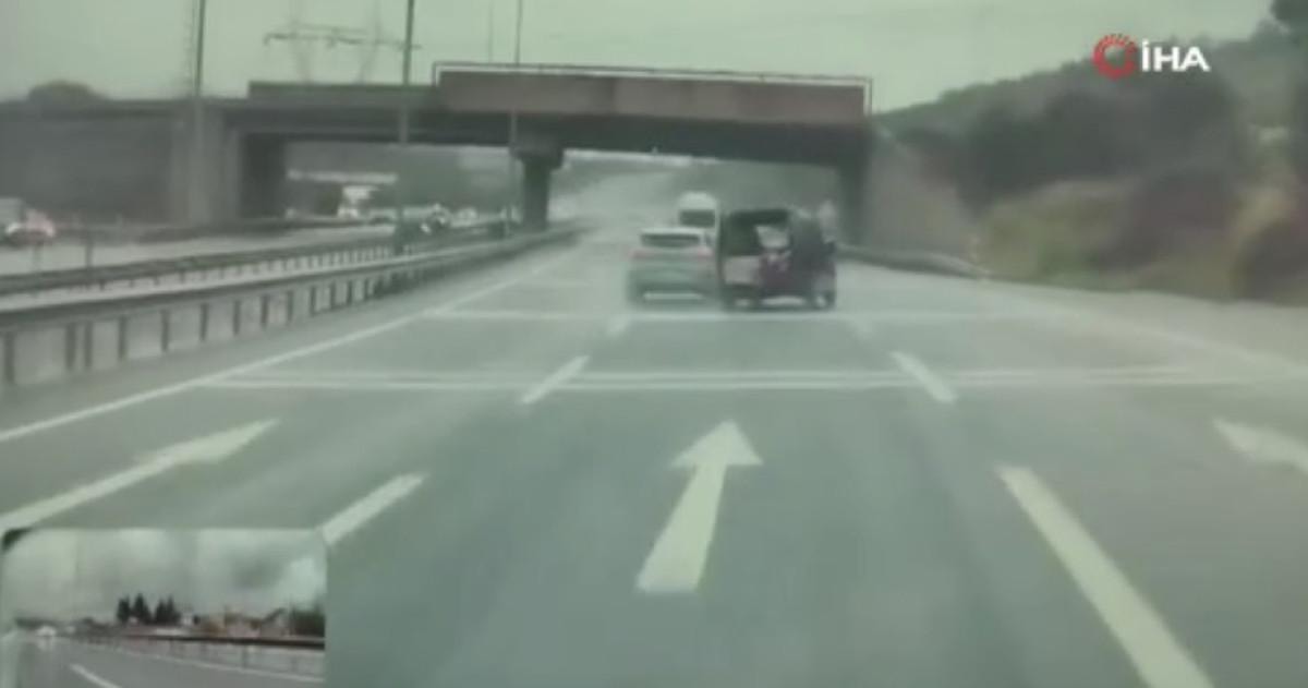 Görüntülerde, manevra yaparak kayan otomobilin hafif ticari araca çarpıp kaza yapmasına neden olduktan sonra hızla kaçtığı, hafif ticari aracın ise bariyerlere çarparak durabildiği görüldü.