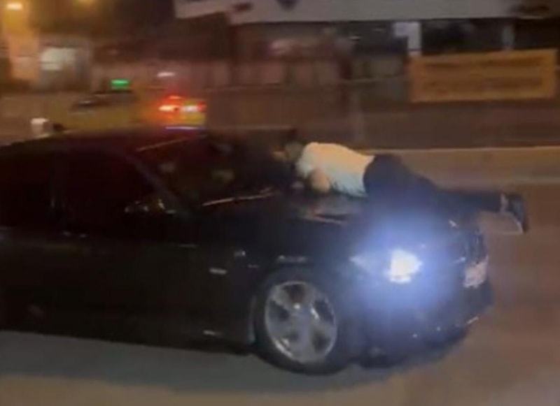Yaklaşık 1 kilometre boyunca aracın kaputunda giden şahıs, "Arabadan in" diye bağırarak aracı yumruklamaya devam etti.