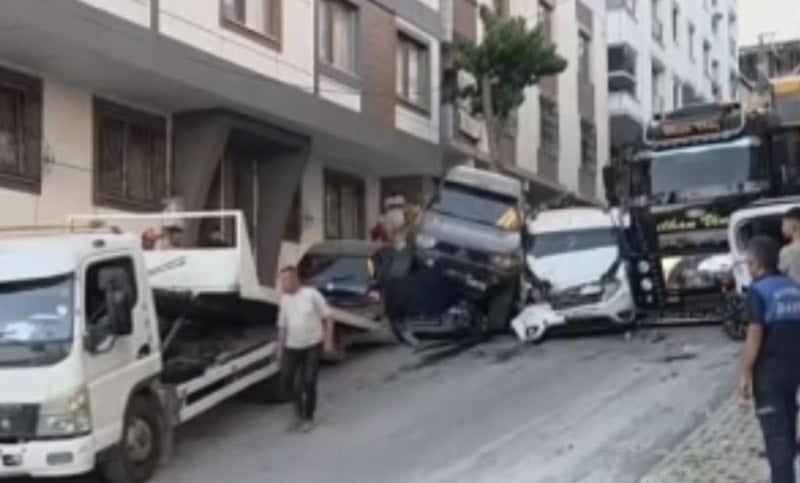 Yokuş aşağı kontrolden çıkan tonlarca ağırlıktaki vinç, park halindeki çok sayıda aracı önüne katıp sürükledi.