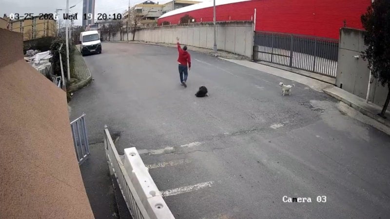 Bu sırada köpeğin sahibiin yanında bulunan diğer köpek de yaralanan köpeğin yanuına geliyor.