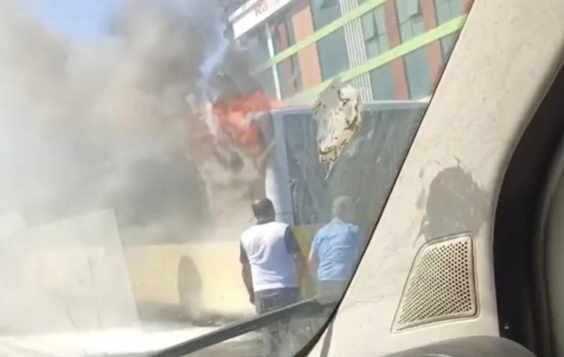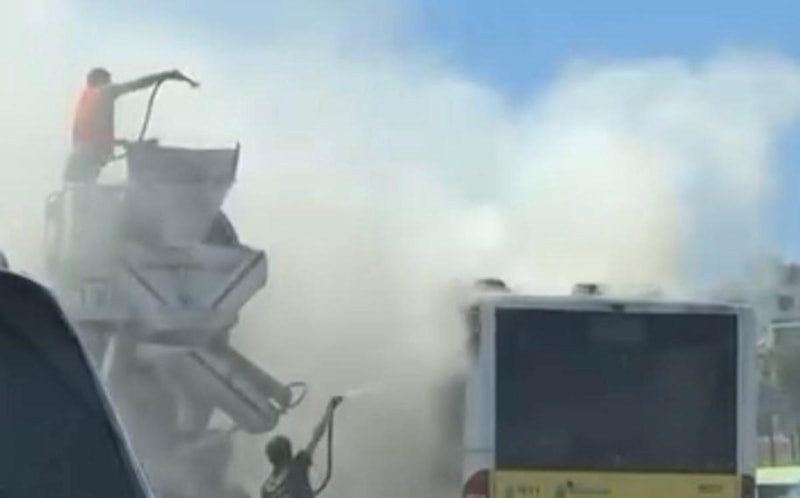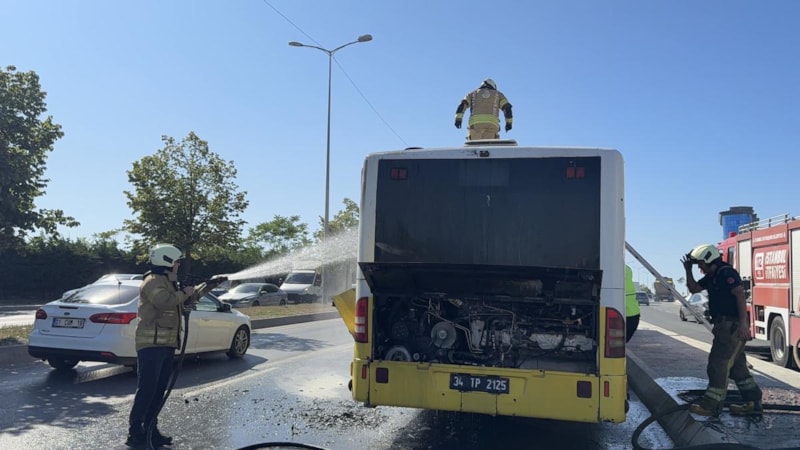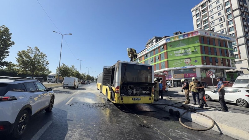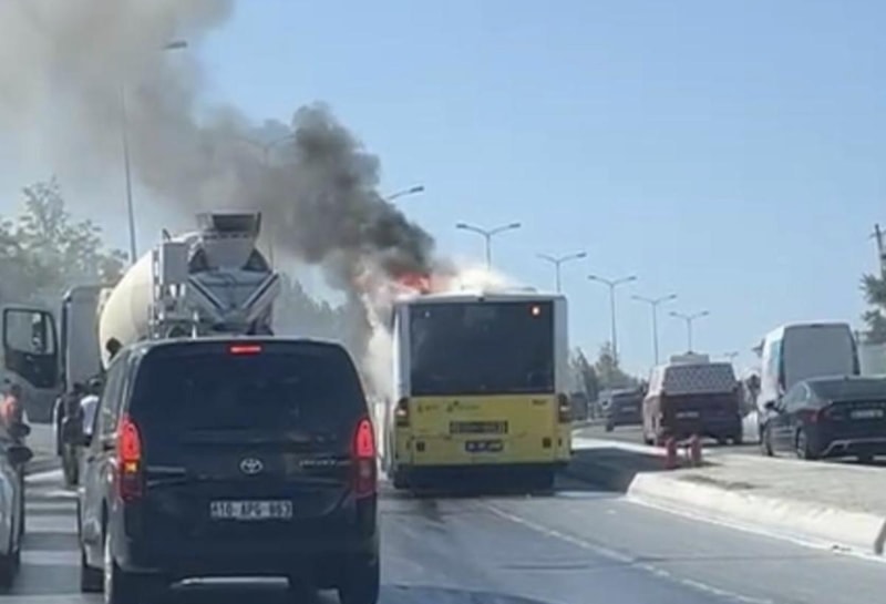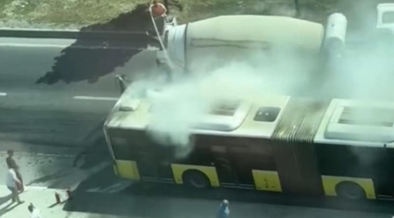Sultangazi'de seyir halinde olan İETT otobüsünün motor kısmı alev aldı. Vatandaşların yangın tüpleriyle müdahalesi yetersiz kalınca yangın, beton mikseri ile söndürülmeye çalışıldı. Müdahale anları cep telefonu kamerası ile kaydedildi.