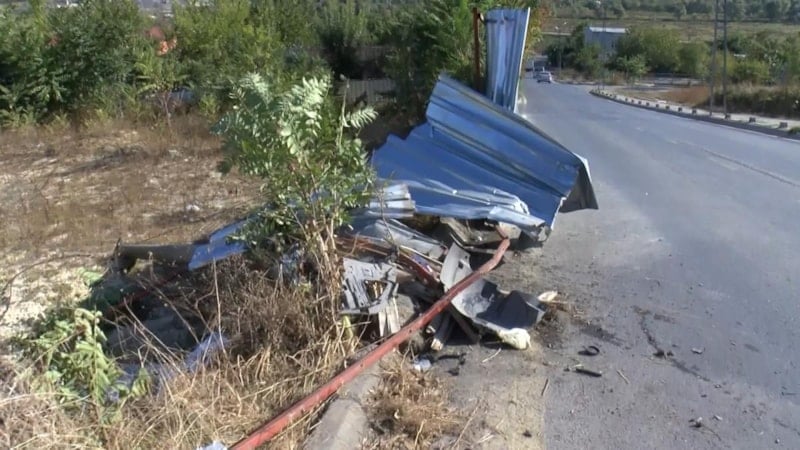 Sürücüsünün direksiyon hakimiyetini kaybettiği otomobil, önce yol kenarındaki telefon direğine ardından da inşaat alanını çevreleyen levhalara çarptı.