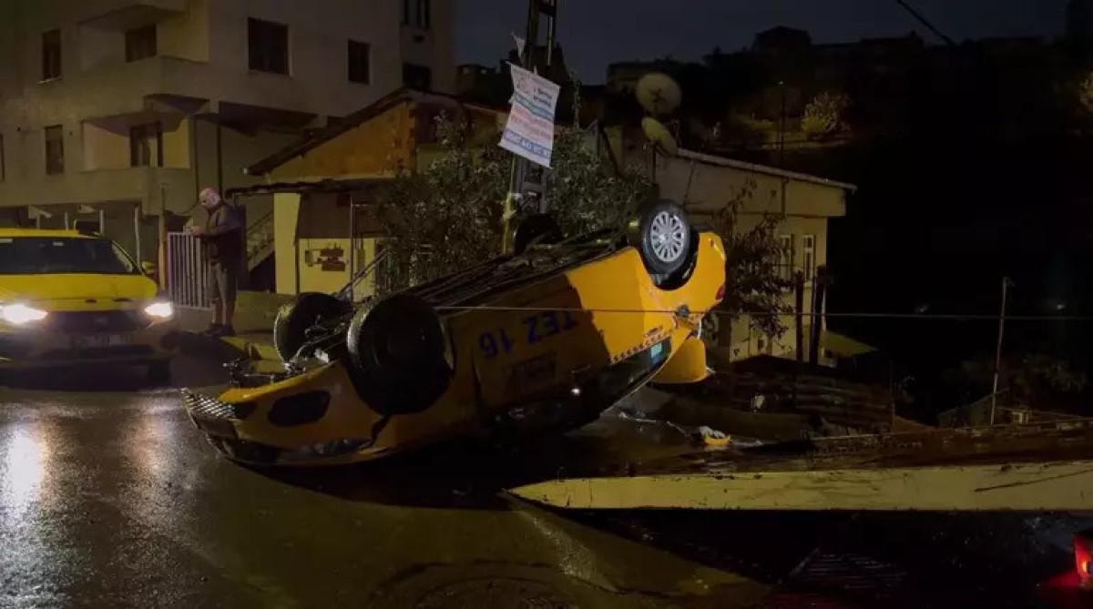 Devrilen taksi, çekici yardımıyla bulunduğu yerden kaldırılırken polis kazayla ilgili inceleme başlattı.