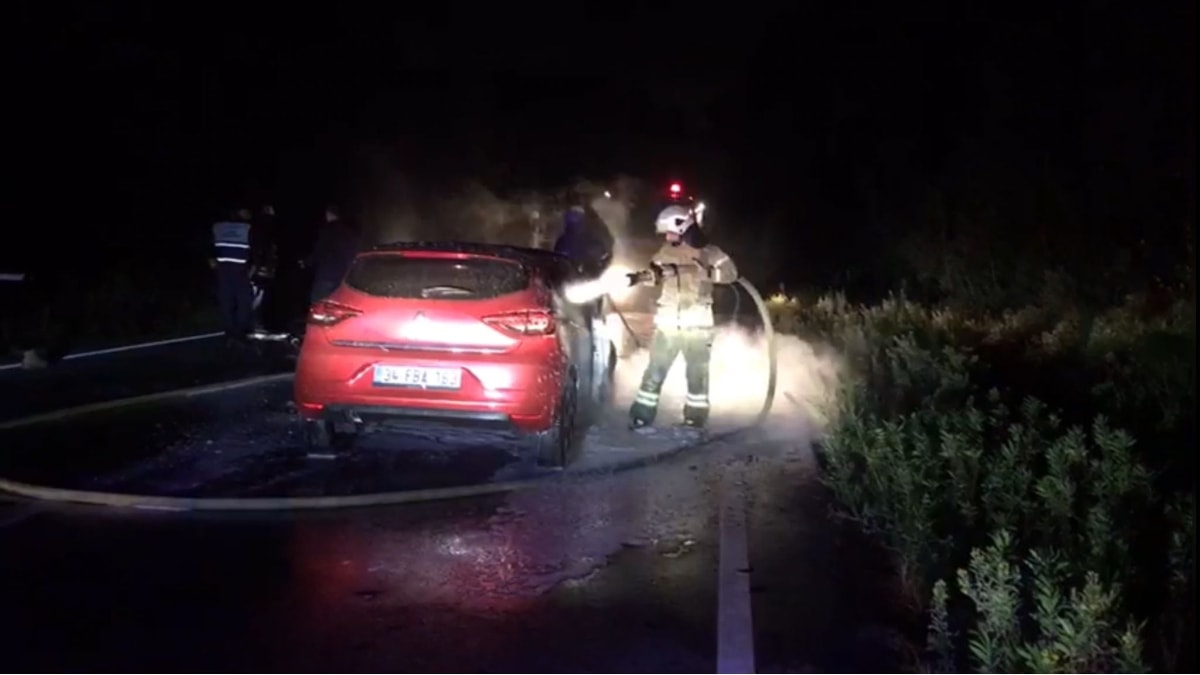 İstanbul Sarıyer'de Garipçe Yolu'nda dün saat 20.00 sıralarında meydana gelen olayda, seyir halinde olan bir otomobilin motor bölümü henüz bilinmeyen bir nedenle yanmaya başladı.