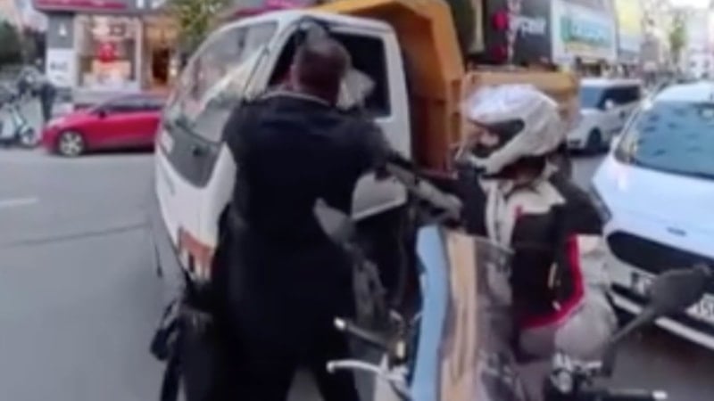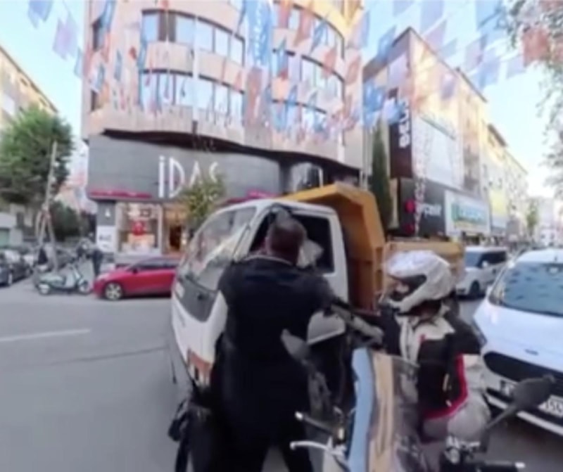 Bağcılar ilçesinde kornaya basan kamyonet sürücüsünü uyaran şahıs, sürücünün tekrar kornaya basmasıyla deliye döndü. O anlar bir motosikletlinin kask kamerasına yansıdı.