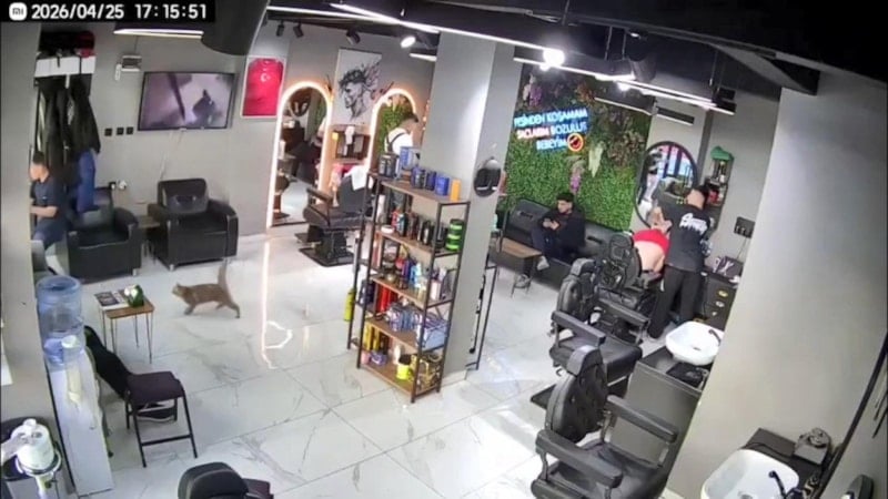 Kediden kaçtıktan sonra kuaföre geri dönen müşteri, hızla kapıyı açıp içeri giriyor. Bu sırada dışarıda oturanlar ise yaşananları izliyor.
