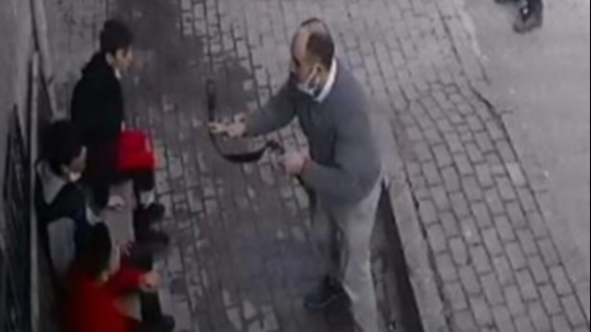 Çocuklar adamın kemerini çıkardığını görünce kaldırımdan kalkarak kaçmaya çalışıyor. Bu sırada saldırgan elindeki kemeri çocuklara doğru sallıyor.