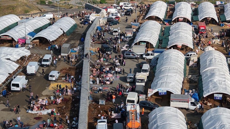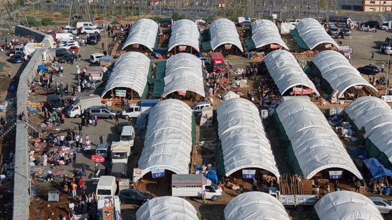 İçerisinde de aynı yoğunluğun devam ettiği Kurban Satış Merkezi, havadan görüntülendi.
