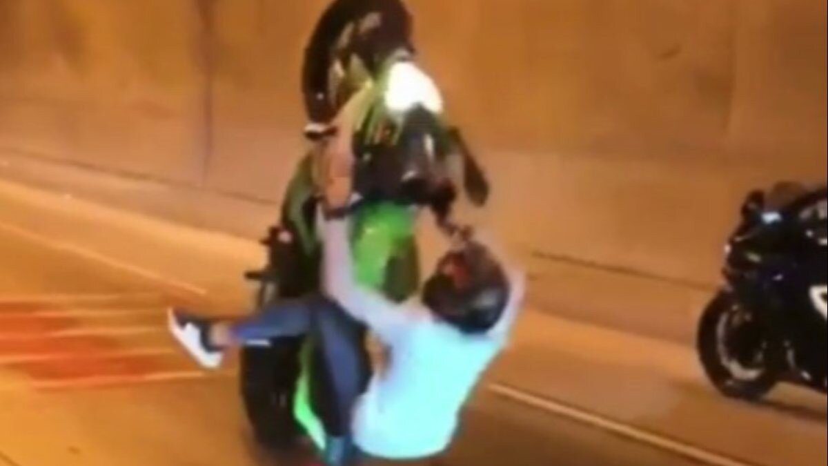 Görüntülerde motosikletlerden birinde iki kişinin olduğu tek tek tekerlek üzerinde ilerlemeye çalışırken iki yolcunun da yere düştüğü görüldü.