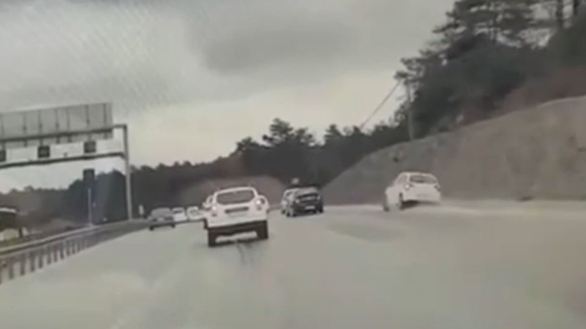 Araçların arasından hızla makas atarak giden 2 araç sürücüsü, yolda ilerleyen başka bir araç sürücüsünün refüje düşerek kazaya karışmasına neden oldu.