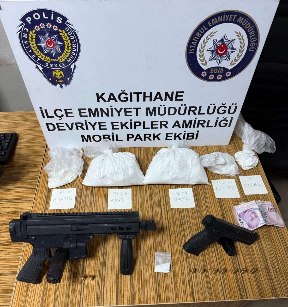 Aramalarda; 1 uzun namlulu otomatik silah, 1 ruhsatsız tabanca ile birlikte 9 adet fişek, 2 kilo 343,5 gram kokain, 455 lira nakit para ve 1 adet cep telefonu ele geçirildi.