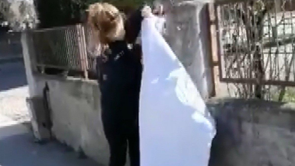 Pankartı asılı olduğu yerden çıkarak kadın çantasına koymaya çalıştı. O esnada durumu gören bir vatandaş "Pankartı neden söküyorsun" diyerek tepki gösterdi.