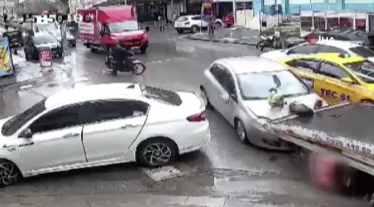 Motosiklet sürücüsü, çarpmanın etkisiyle sürüklenerek park halindeki çekici ile otomobil arasında ezildi. Yaralanan moto kurye hastaneye kaldırılırken, otomobil sürücüsü gözaltına alındı.
