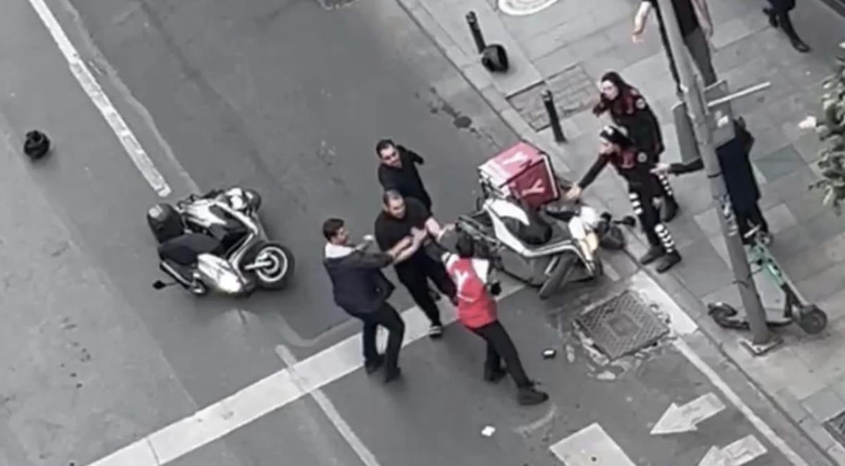 Motosiklet sürücüsü sinirle kaskını yere fırlatarak kuryeyi darbederken, kurye ise saldırganın motosikletini tekmeleyerek yere düşürdü.