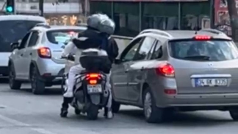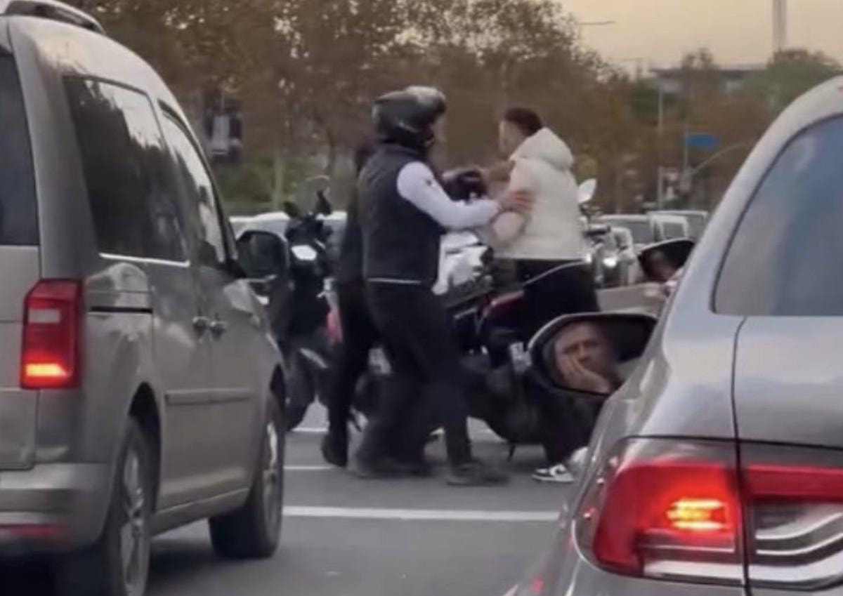 Kırmızı ışıkta duran motosikletli 2 kişi, henüz bilinmeyen bir nedenle tartışmaya başladı.
