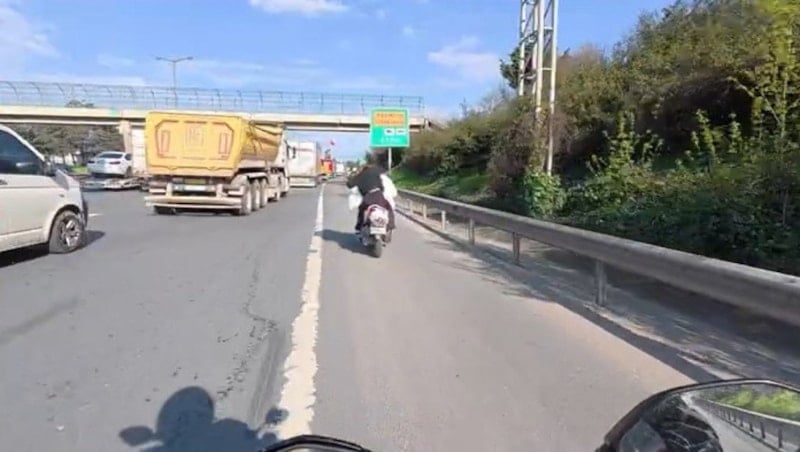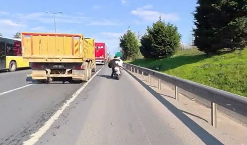 Ataşehir TEM Otoyolu'nda seyir halindeki motosiklet sürücüsünün, arkasında oturan kadının saçını çekmesi motosikletteki kadın dengesini kaybederken kadının kamyonun altında kalmaktan son anda kurtulduğu anlar kameraya yansıdı.