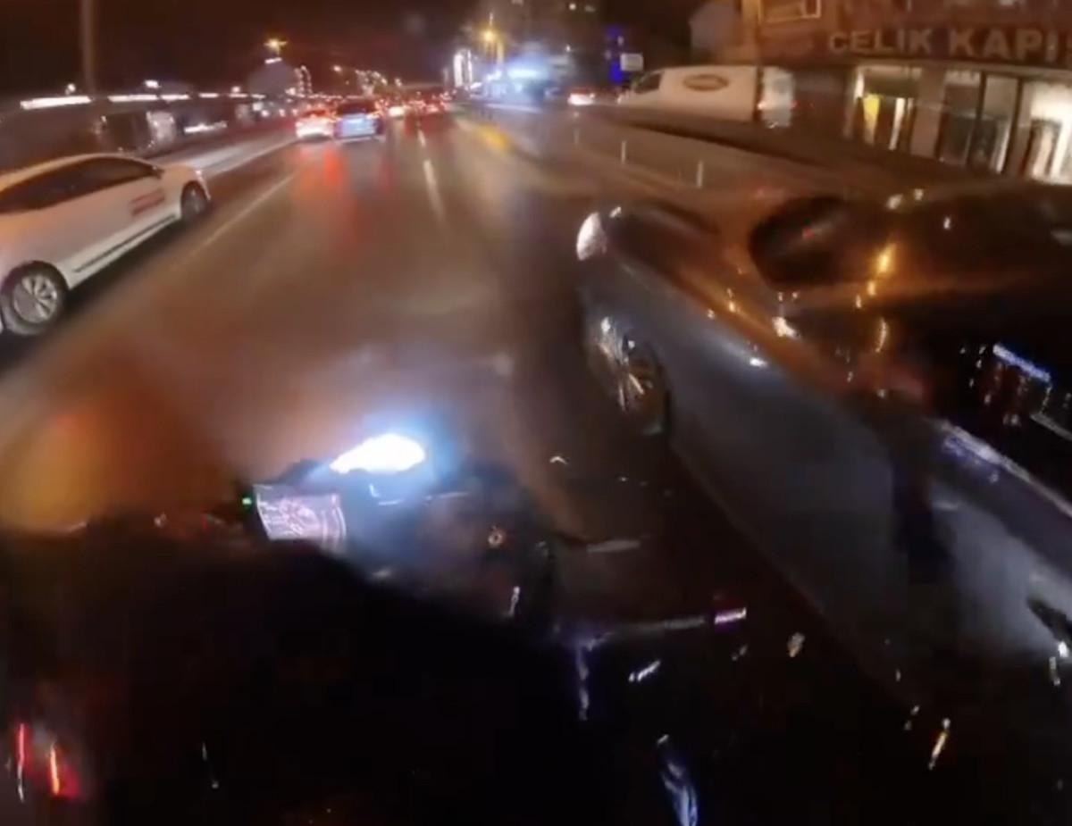 Daha sonra otomobilin diğer önünü kestiği motosiklet sürücüleri, kornaya basarak otomobili durdurmaya çalıştı.