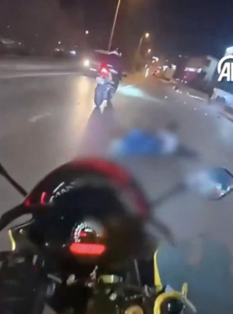 Motosiklet sürücüsünün yayaya çarptığı anlar, aynı yönde giden başka bir motosikletin kask kamerası tarafından kaydedildi.