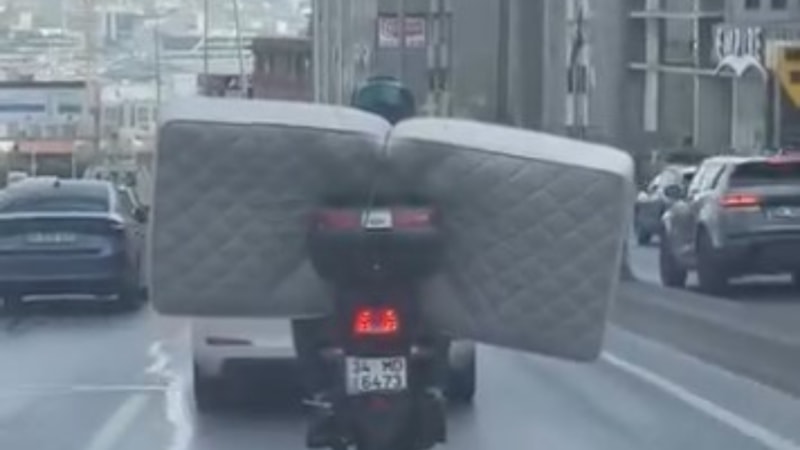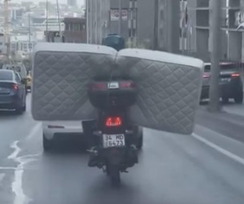 Beylikdüzü'nde bir kişinin motosiklet ile yatak taşıdığı anlar, diğer sürücüler tarafından cep telefonu kamerasıyla kaydedildi.