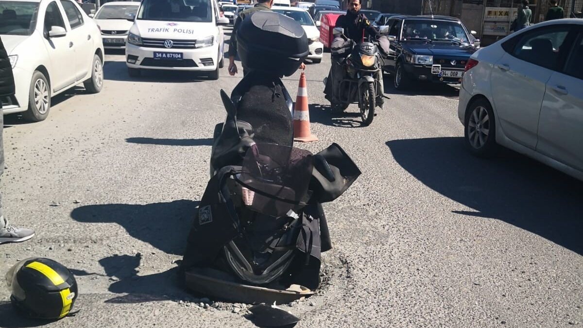 Neye uğradığını şaşıran adam yere savrulurken, motosikletin ön tekerliği ise rögarın içinde kaldı.
