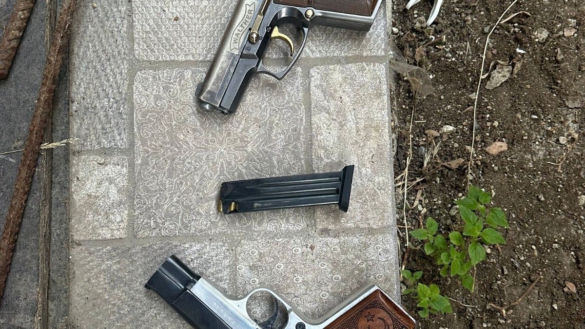 Şüphelilerden L.D.'nin adresinde 2 adet ruhsatsız tabanca, tabancalara takılı 2 adet şarjör ve 3 adet fişek ele geçirildi.