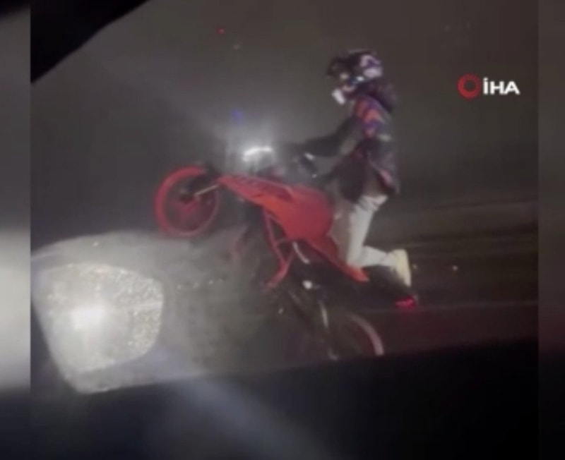Kuzey Marmara Otoyolu Cebeci mevkiide bir motosiklet sürücüsünün, yağışlı havaya rağmen orta şeritte düşük hızla ilerleyerek akrobatik hareketler yaptığı anlar kameralara yansıdı.
