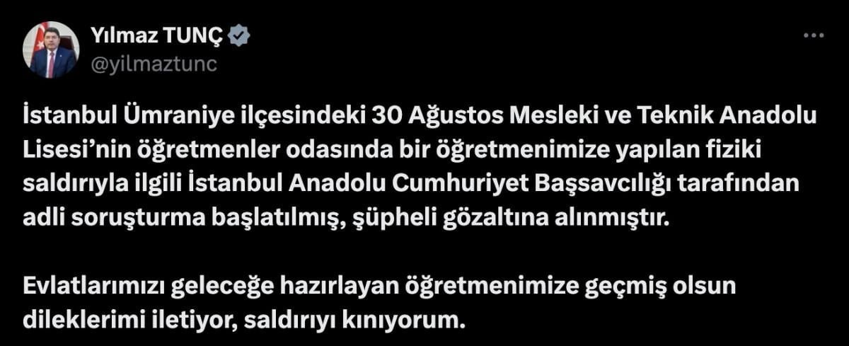 Öte yandan yaşanan olaya ilişkin Adalet Bakanı Yılmaz Tunç'tan bir açıklama geldi.