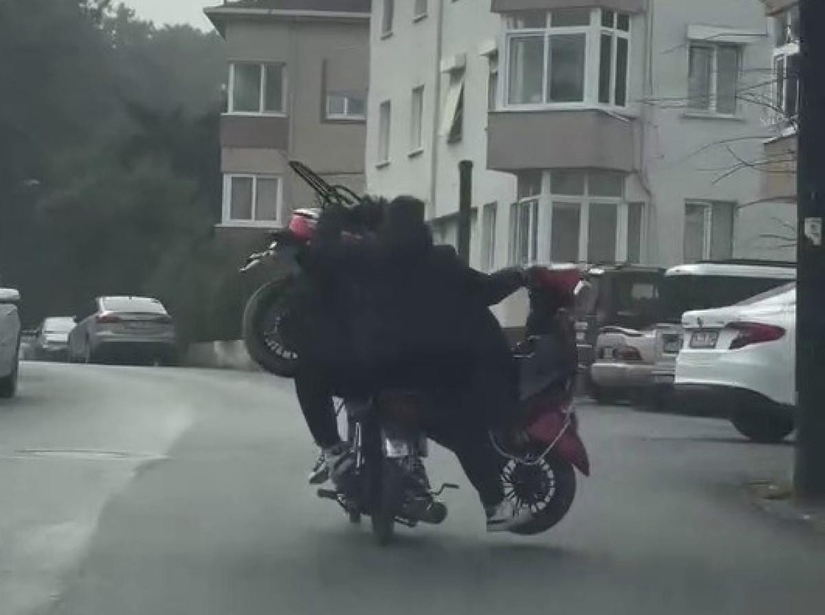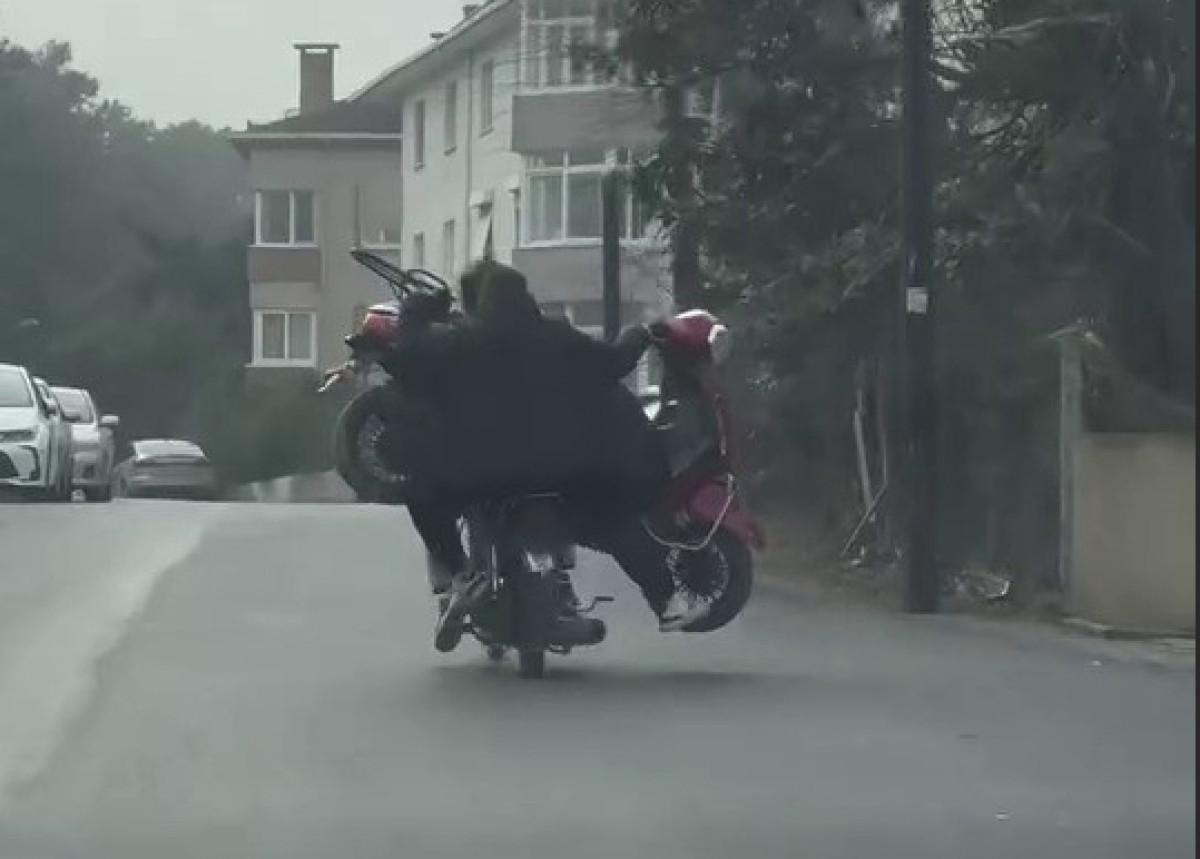 İstanbul Şile'de motosikletle seyir halinde olan 2 kişi, bindikleri motosikletin üzerine başka bir motosiklet yükledi.